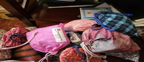 Friends of Gyabolanders sorting and assemble the menstrual hygiene kits, adding soap, menstrual calendars, pens, additional pads and deodorants to each kit.
